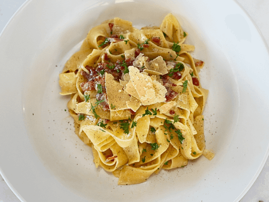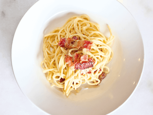 Crispy bacon, with confit garlic, onion, fresh egg yolk, parmesan cheese, a dash of wine & cream reduction & a crack of fresh black pepper