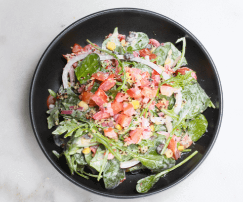 Quinoa, spinach, lettuce, red onion, grilled capsicum, corn, black beans, pico de gallo, ranch