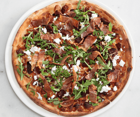 Roasted beets, prosciutto, pine nuts, red onion, rosemary & black pepper, with goats cheese, rocket & balsamic