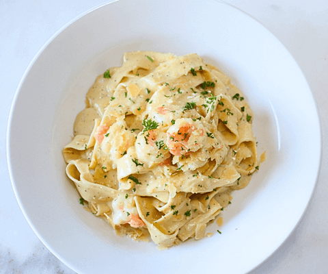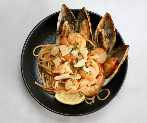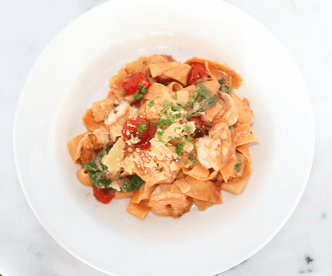 Rich tomato cream sauce, with prawns, baby spinach, cherry tomatoes, herbs & parmesan