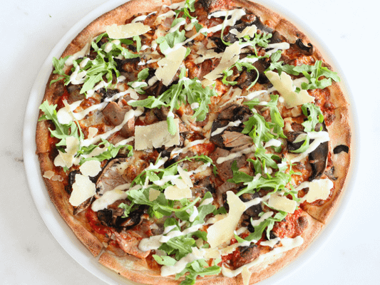 Tomato sugo, mozzarella, beef, caramelised onion, sauteed mushrooms, garlic, pepper, rocket & horseradish creme