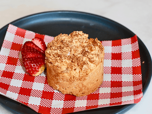 (GF) Flourless toasted almond meal cake with a raspberry compote centre topped with crunchy coconut macaroon.