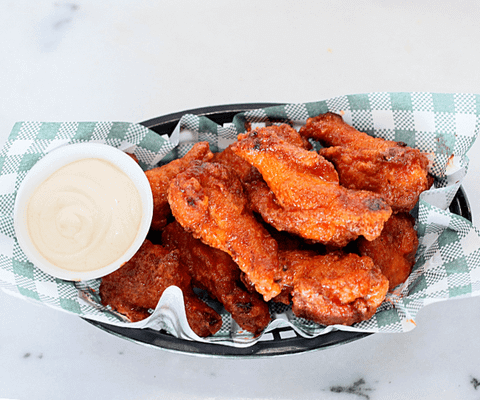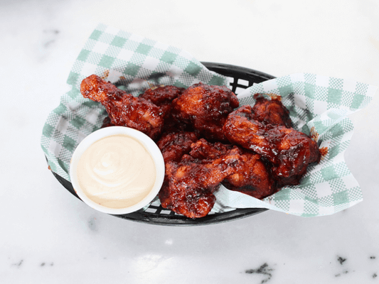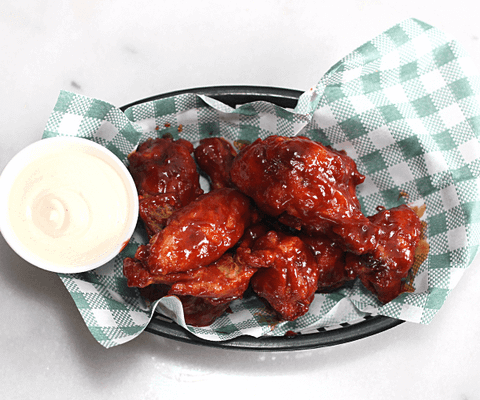 Tossed in BBQ sauce with ranch dipping sauce & celery twigs.