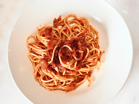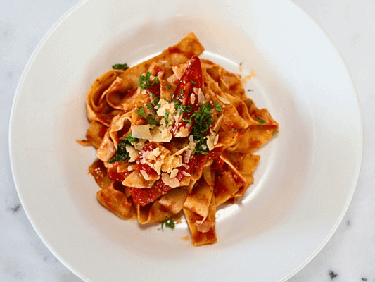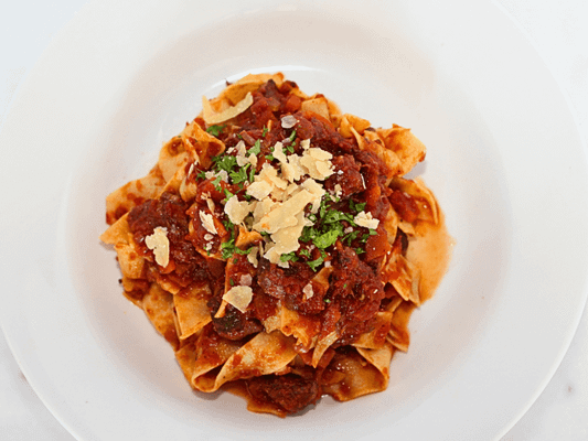 Slow cooked, rich tomato, beef & red wine ragu, with parmesan & herbs