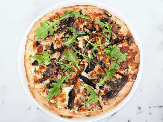 Sauteed mushrooms on ricotta, with carmelised onion, thyme, confit garlic, mozzarella, rocket & truffle