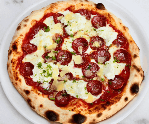 Buffalo mozzarella, salami, confit garlic, fior di latte, tomato sugo, parmesan & parsley