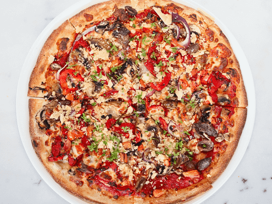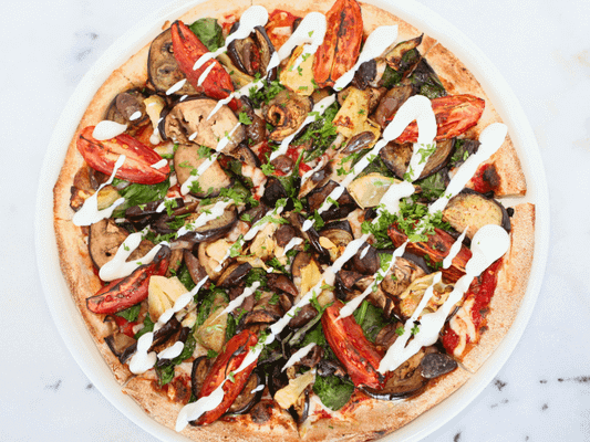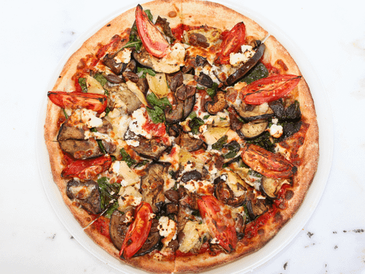 Pizza sauce, vegan cheese, spinach, eggplant, artichokes, Roma tomatoes, olives, confit garlic. parsley & vegan aioli