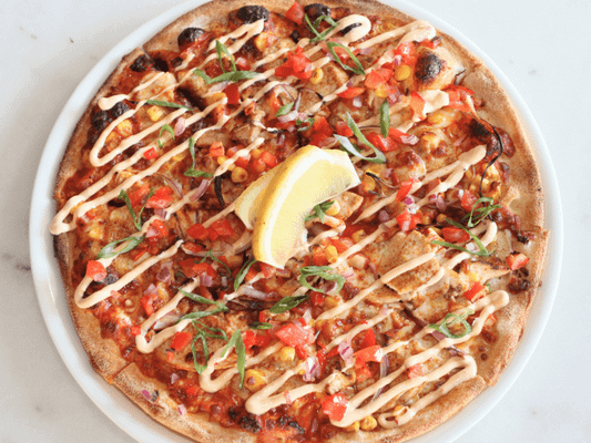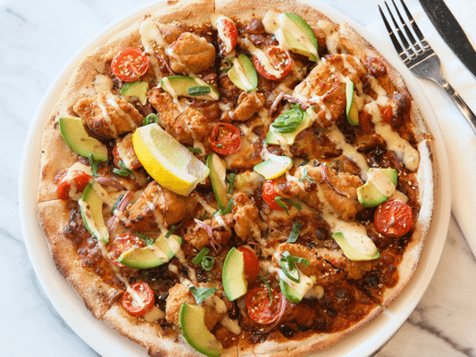 Sweet soy, sesame, mozzarella, shallots, karaage chicken, onion, cherry tomatoes, fresh avocado, sesame mayo & lemon. Note: The Karaage Chicken used on this pizza is crumbed and contains Gluten. Sweet Soy Sauce contains Gluten