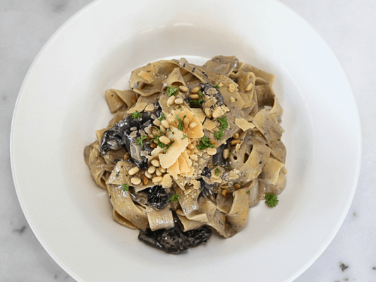 Wine cream reduction, with confit of garlic, porcini mushrooms, pine nuts, truffle & parmesan