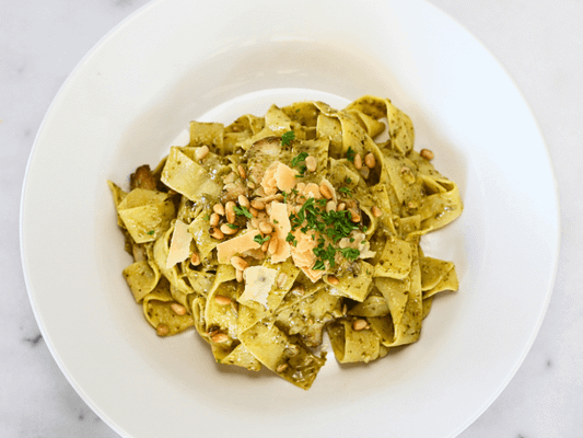 House basil pesto with cream sauce & sliced chicken, parmesan & parsley