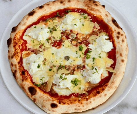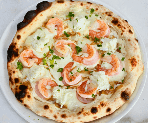 Fior di latte, sugo bianco, prawns, buffalo mozzarella, garlic confit, parsley, parmesan & E.V.O.O.