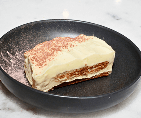 Chef Gregg's elegant and rich Italian dessert with delicate ladyfinger cookies, dressed with espresso, and layered with creamy mascarpone cheese, and dusted with cocoa.