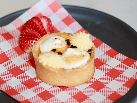 Butter shortbread shell filled with creamy passionfruit curd and topped with marshmallow and zesty passionfruit jelly.