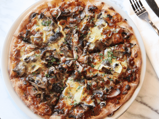 Pizza sauce, mozzarella, ham, button & sauteed mushrooms, confit garlic, thyme & brie. Finished with truffle & parsley