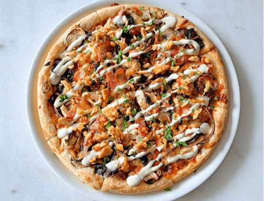 BBQ sauce, cheese, chicken, sauteed mushrooms, garlic, herbs, red onion & bacon, blue cheese sauce & pork crackling
