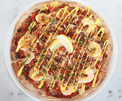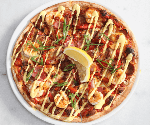 Pizza sauce, mozzarella, shallots, beef, capsicum, bacon, Spanish onion, Cajun rubbed prawns, hollandaise & lemon