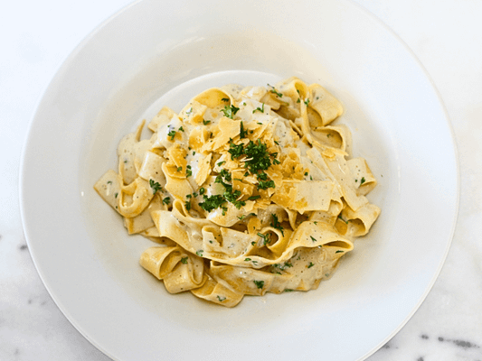 Rich, cheese cream sauce, with extra parmesan, and garlic confit & seasonings Add bacon $3