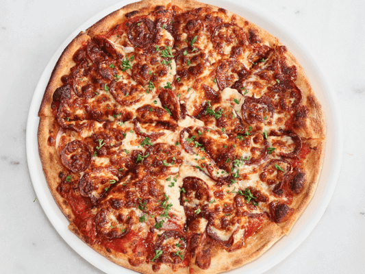Pizza sauce, mozzarella, Spanish onion, pepperoni, oregano, black pepper, parmesan & parsley