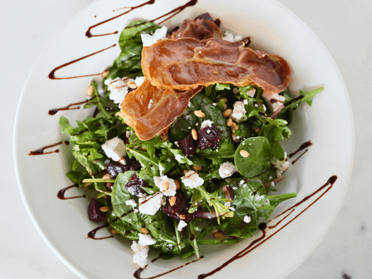 Roasted beets, rocket, spinach, red onion, pine nuts, prosciutto, goats cheese, e.v.o.o. & balsamic