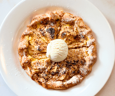 Apples on sweet custard base, topped with crispy crumble served with ice cream