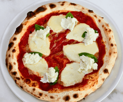 Tomato sugo, fior di latte, confit garlic, oregano, buffalo mozzarella, basil leaf & E.V.O.O.