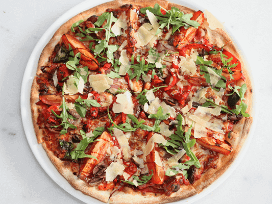 Sugo, mozzarella, pepperoni, red onion, capsicum, olives, garlic, herbs, Roma tomatoes, rocket, balsamic & parmesan Free anchovies available on request
