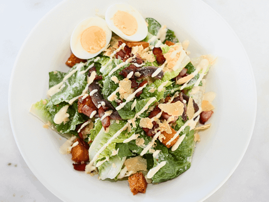 Bacon, cos lettuce, house croutons, parmesan cheese, creamy Caesar dressing, egg & anchovies