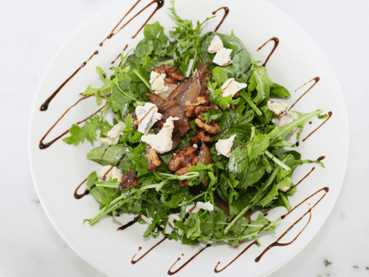 Pears with rocket, gorgonzola, toasted walnuts, e.v.o.o. & balsamic