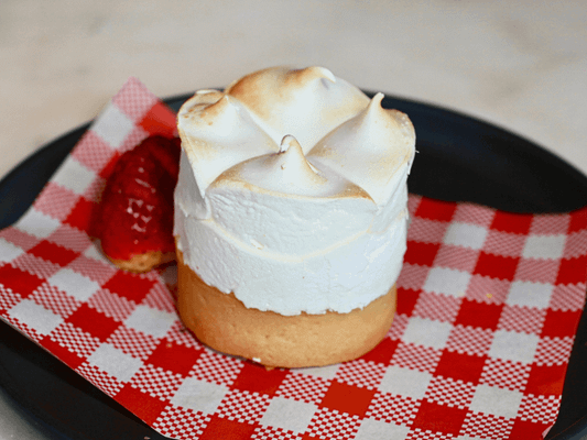Butter shortbread tart filled with tangy lemon curd, topped with flamed Italian meringue
