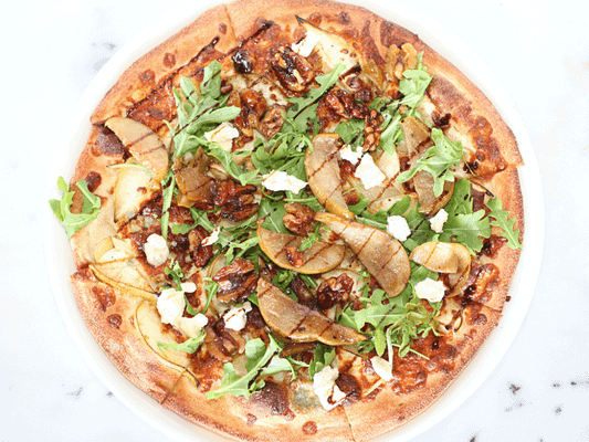 Sliced pears with walnuts, gorgonzola cheese, rocket, parmesan & balsamic reduction