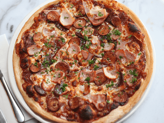 Pizza sauce, cheese, ham, pepperoni, red onions, olives, roast capsicum, mushrooms, garlic, herbs & parmesan. Free anchovies available on request