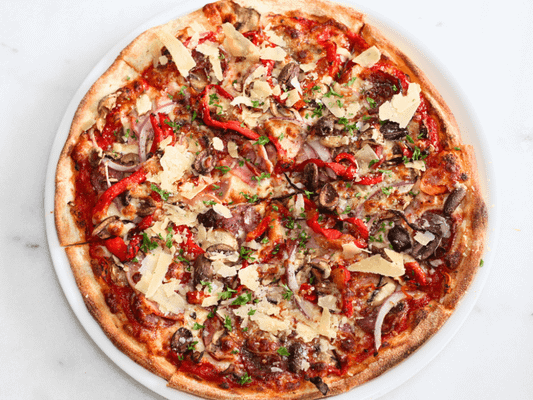 Pizza sauce, mozzarella, mushrooms, Spanish onion, capsicum, tomato, olives, garlic, oregano & parmesan