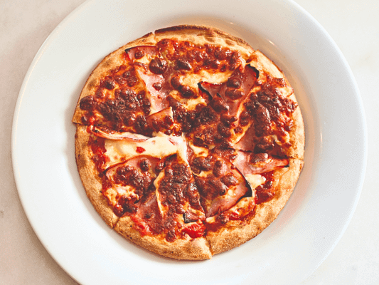 Pizza sauce, mozzarella, ham, pineapple & bacon