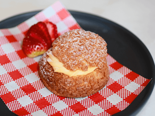 Crust, craquelin choux bun filled with vanilla crème pâtissière, and caramel.