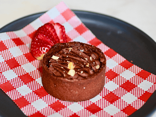 Dark chocolate tart shell filled with chocolate and hazelnut mousse with a hazelnut praline centre.