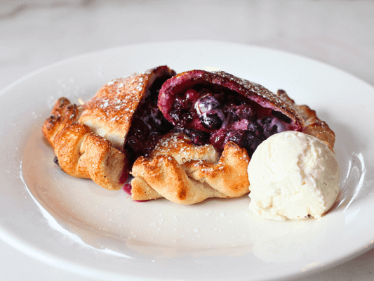 Berries of the season with chocolate ganache sauce, baked calzone style