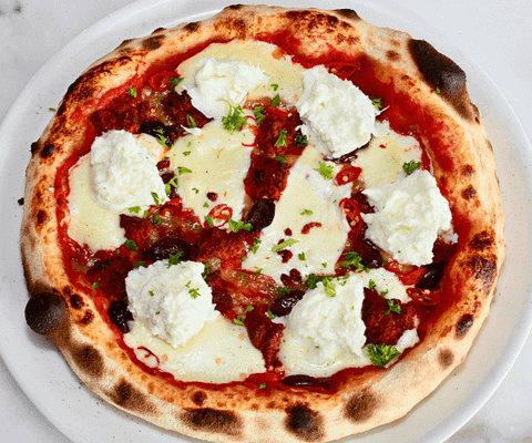 Tomato sugo, buffalo mozzarella, nduja, garlic confit, chilli, olives, fior di latte, parsley & parmesan